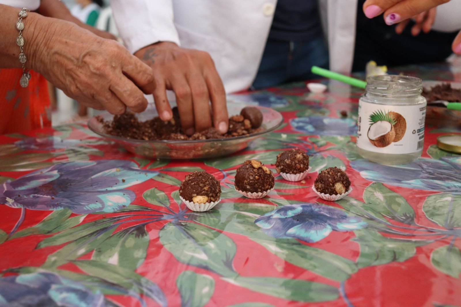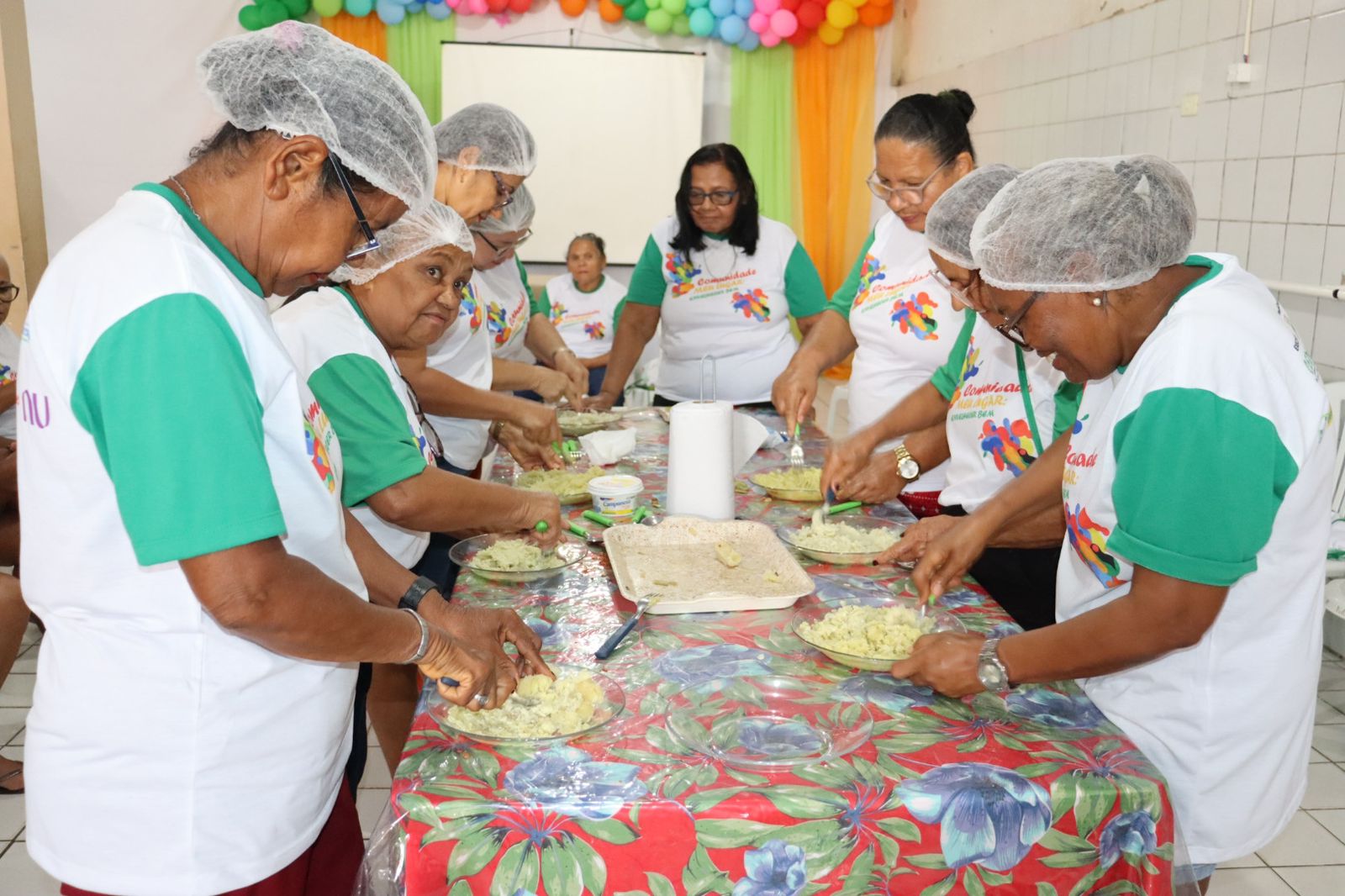 Durante a oficina os idosos beneficiários do projeto puderam aprender a fazer brigadeiro de banana e coxinha de batata doce com aveia e linhaça.