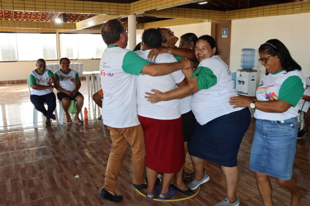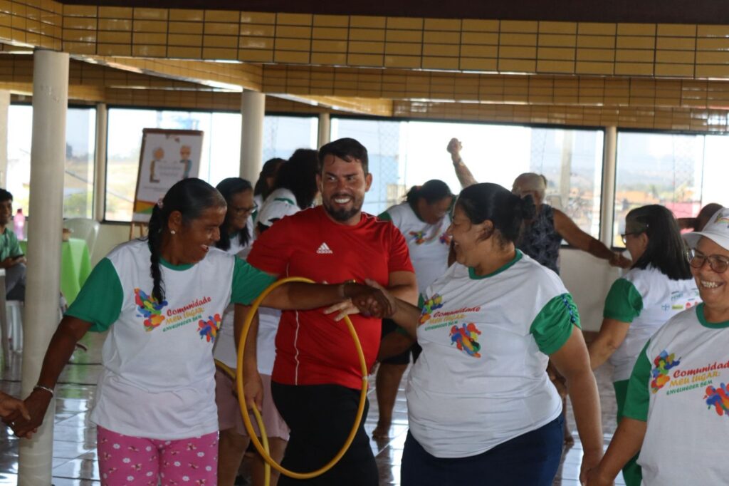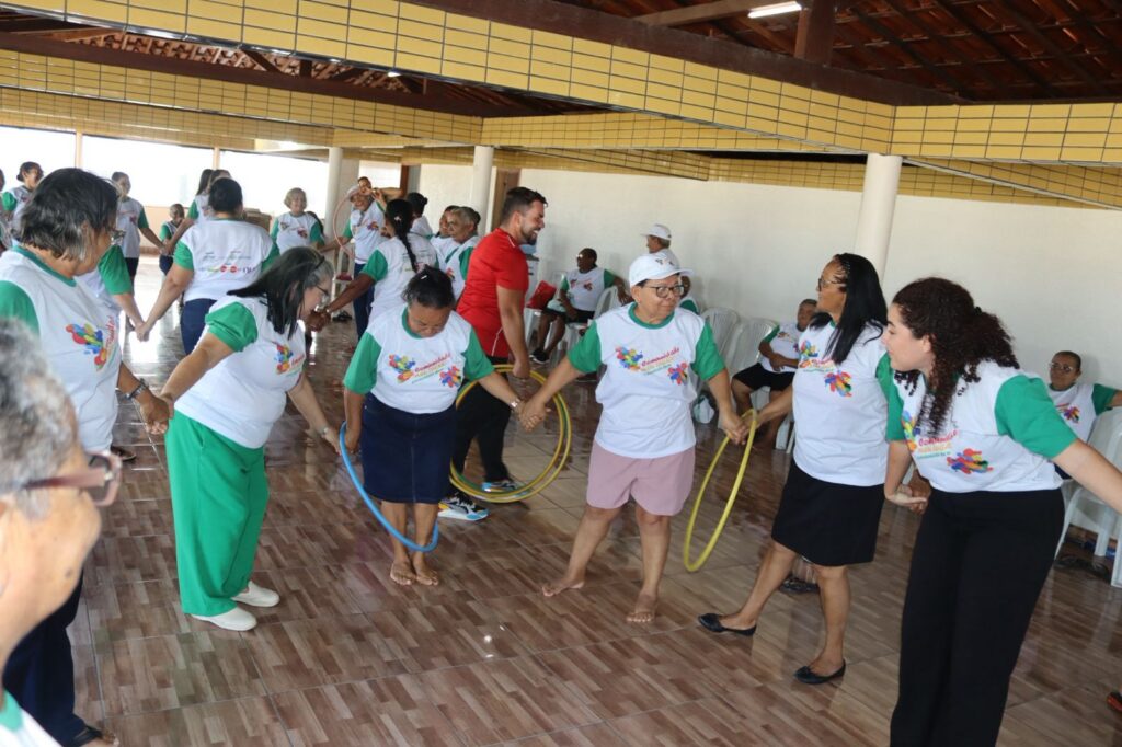 Durante o encontro, os idosos vivenciaram momentos de descontração, com uma série de brincadeiras e atividades de dança, planejadas para estimular a interação social e a melhoria do bem-estar físico e emocional.